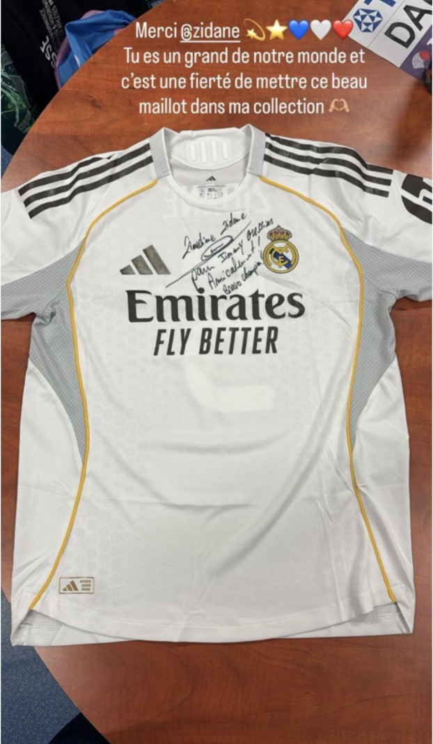 吉米-格雷西耶在展示齐达内赠予的皇家马德里俱乐部签名球衣时配文:“衷心感谢齐达内先生,您是当代体育界最具影响力的传奇人物之一,这件极具收藏价值的球衣将成为我个人藏品中的珍贵资产。”